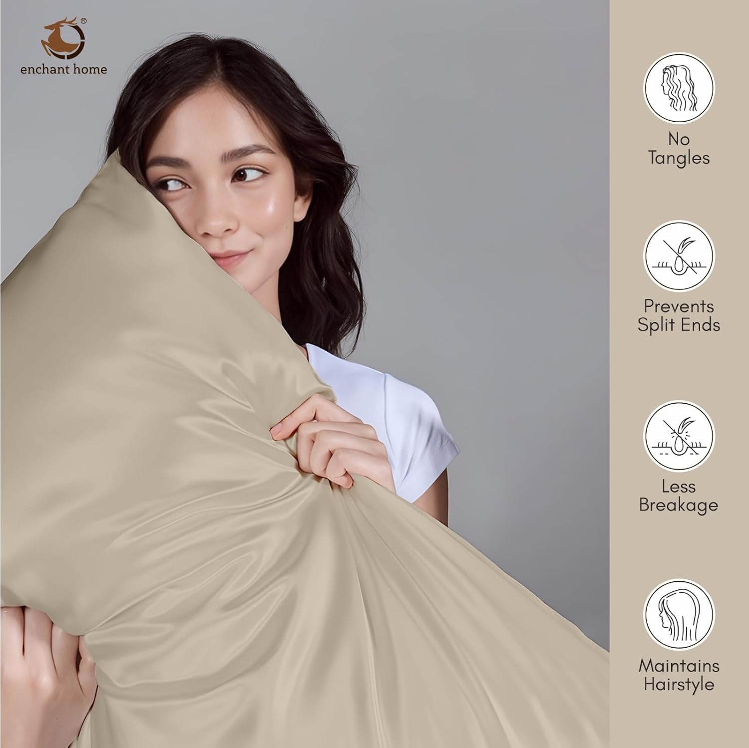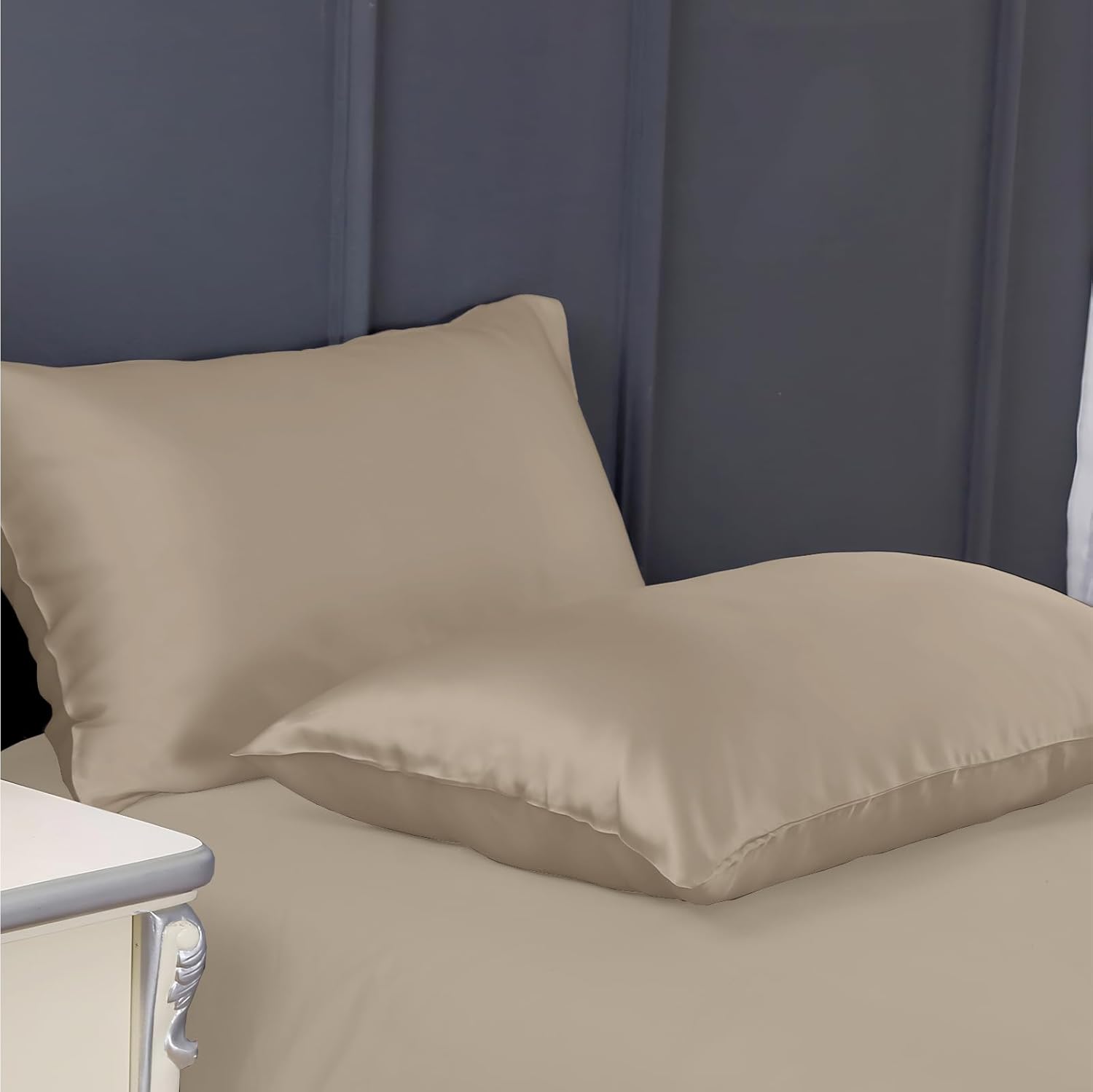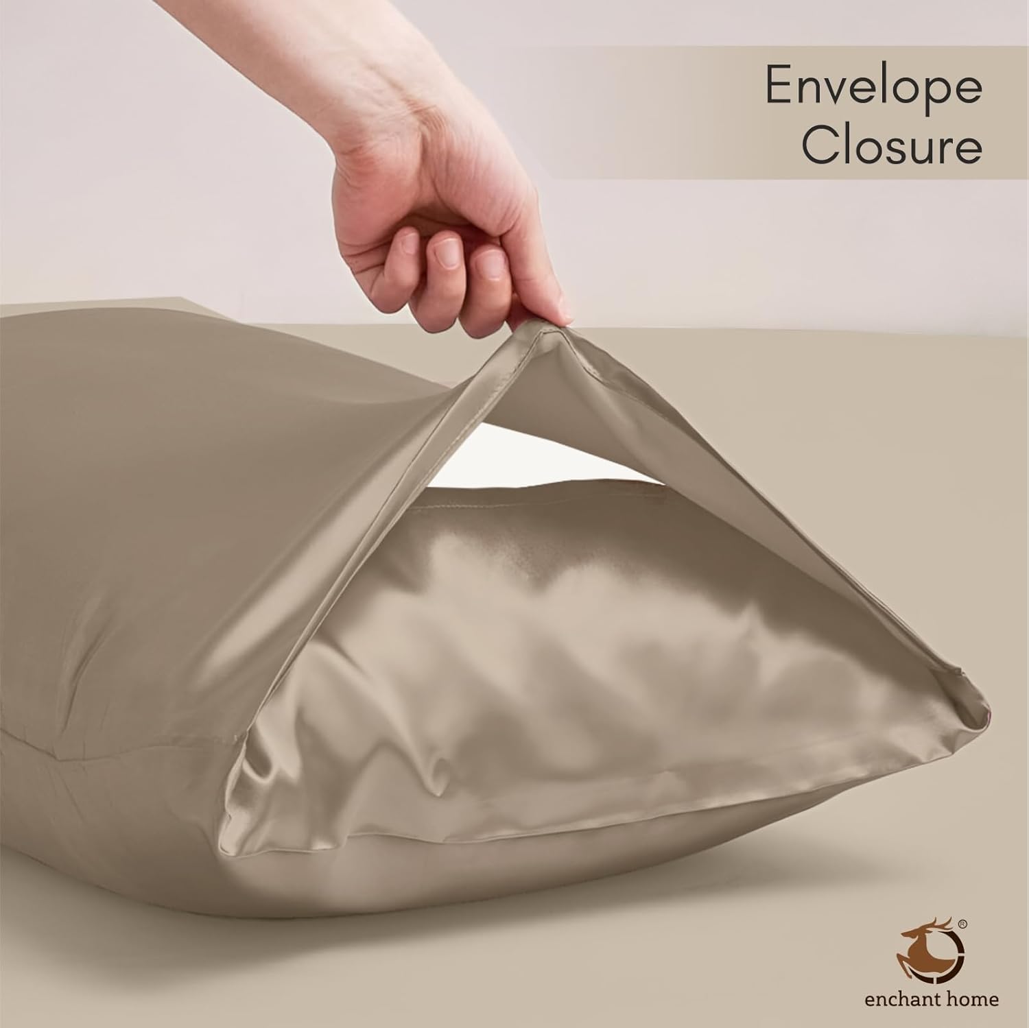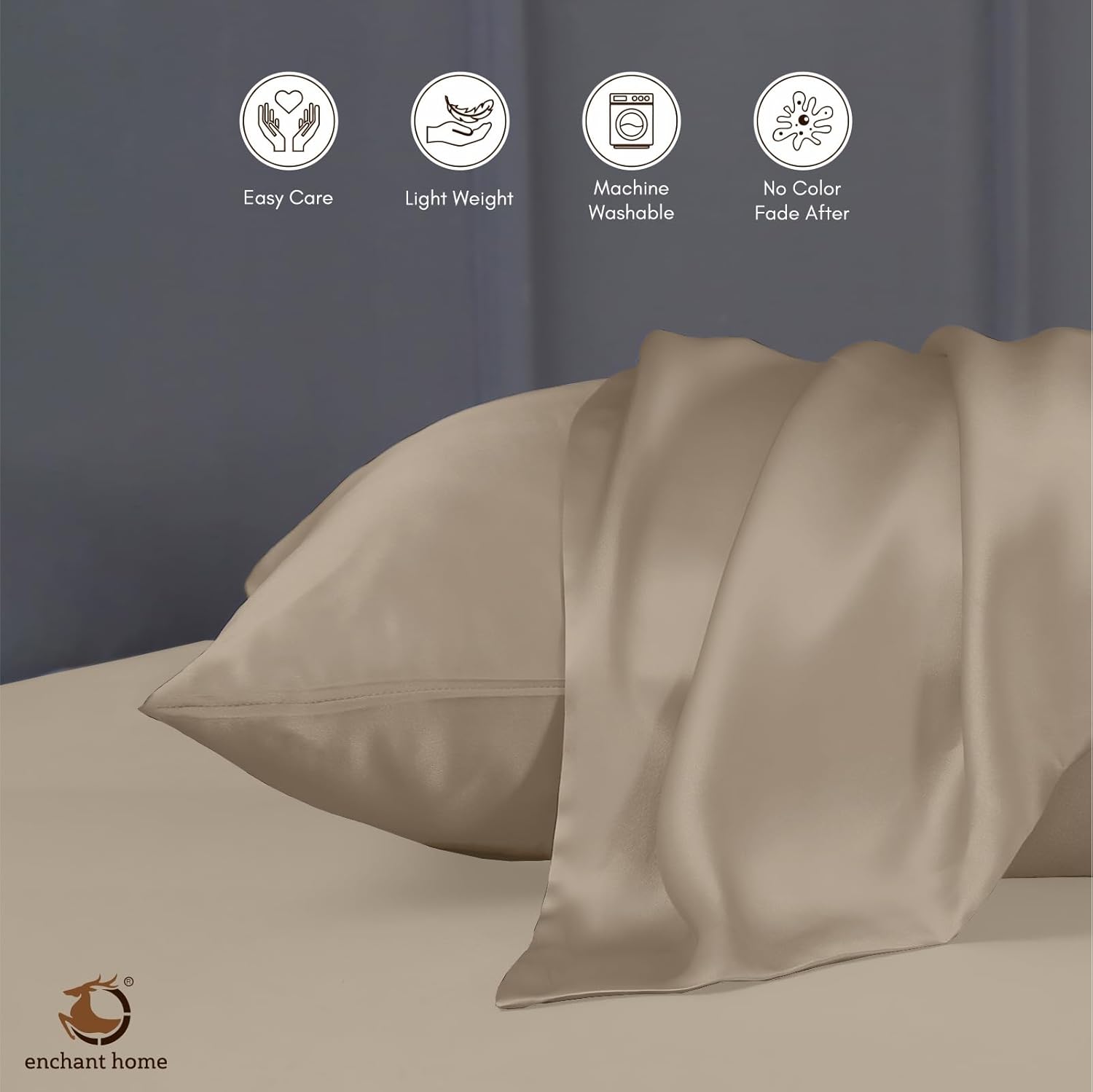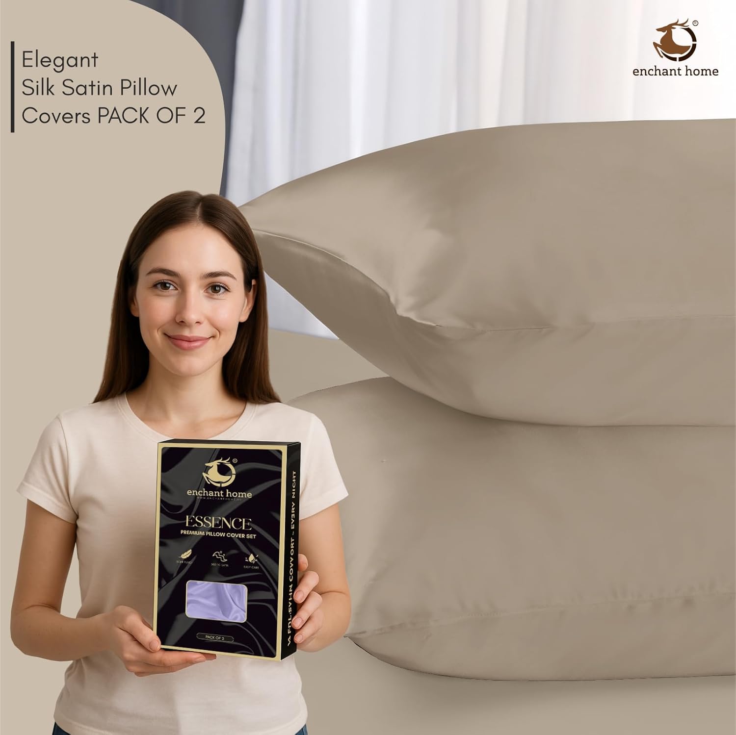 The Enchant Home 300 TC Art Silk Satin Pillow Cover Set in beige offers a refined blend of luxury and durability. Made from high-quality satin with a 300 thread count, these pillow covers deliver a soft, silky touch while resisting wear. The envelope closure design ensures easy insertion and secure fit without zippers, preserving a clean, elegant appearance. This set of two pillow covers enhances both comfort and style, making it an ideal choice for those seeking cozy yet sophisticated bedding accessories.