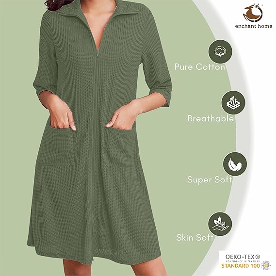 Enchant Home Pure Cotton Waffle Knit Zipper Bathrobe for Women is made with 100% pure cotton, ensuring a soft and comfortable fit. The waffle knit design adds texture and style, while the zipper and pockets provide functionality. Perfect for a cozy and practical bathrobe option for women.