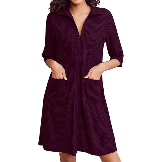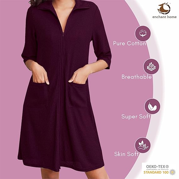 Enchant Home Pure Cotton Waffle Knit Zipper Bathrobe for Women is made with 100% pure cotton, ensuring a soft and comfortable fit. The waffle knit design adds texture and style, while the zipper and pockets provide functionality. Perfect for a cozy and practical bathrobe option for women.
