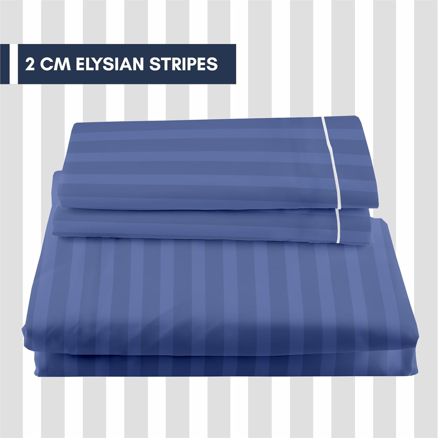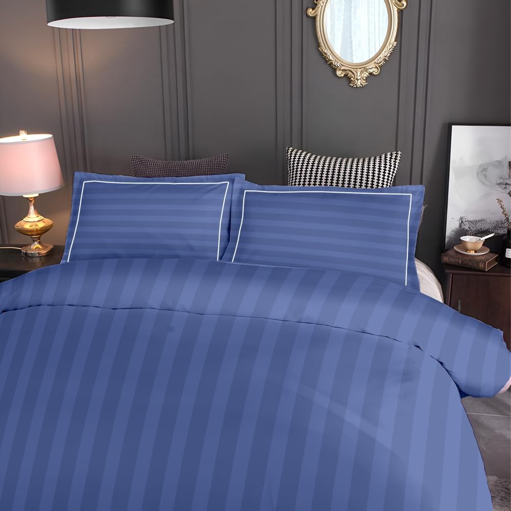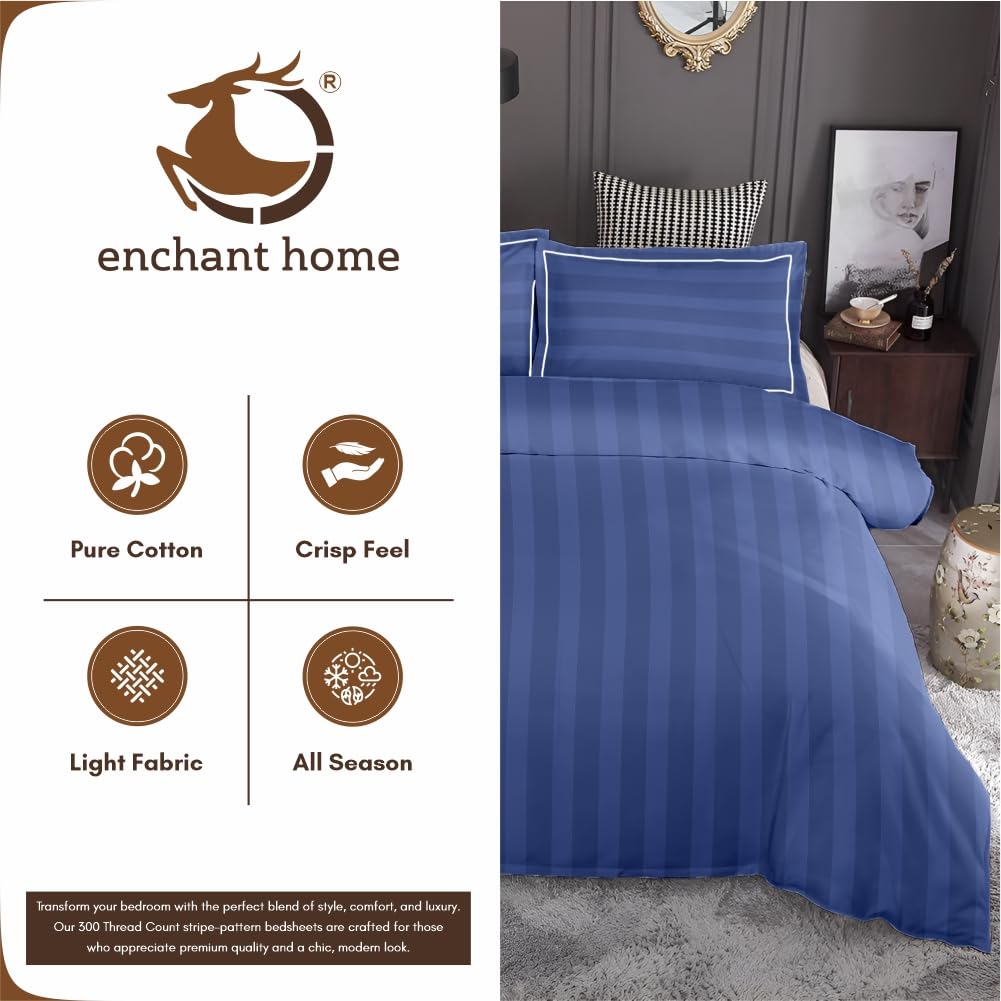 Elevate your bedroom with the Customizable Pure Cotton Dyed Elysian Satin Stripes Bedsheet in Blue. Crafted from premium 300-thread-count cotton satin, this king-size set offers a smooth, breathable finish that blends softness with durability. The refined 2 cm sateen stripe pattern woven into the fabric brings understated elegance. In comparison, the complete set includes one flat sheet and an embroidered pillow cover (46 x 69 cm) (if required), providing a cohesive and luxurious bedding solution. Designed by Enchant Home for lasting comfort with style and customizable according to your requirements.