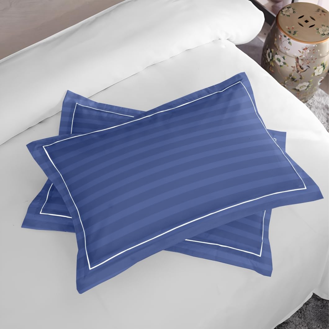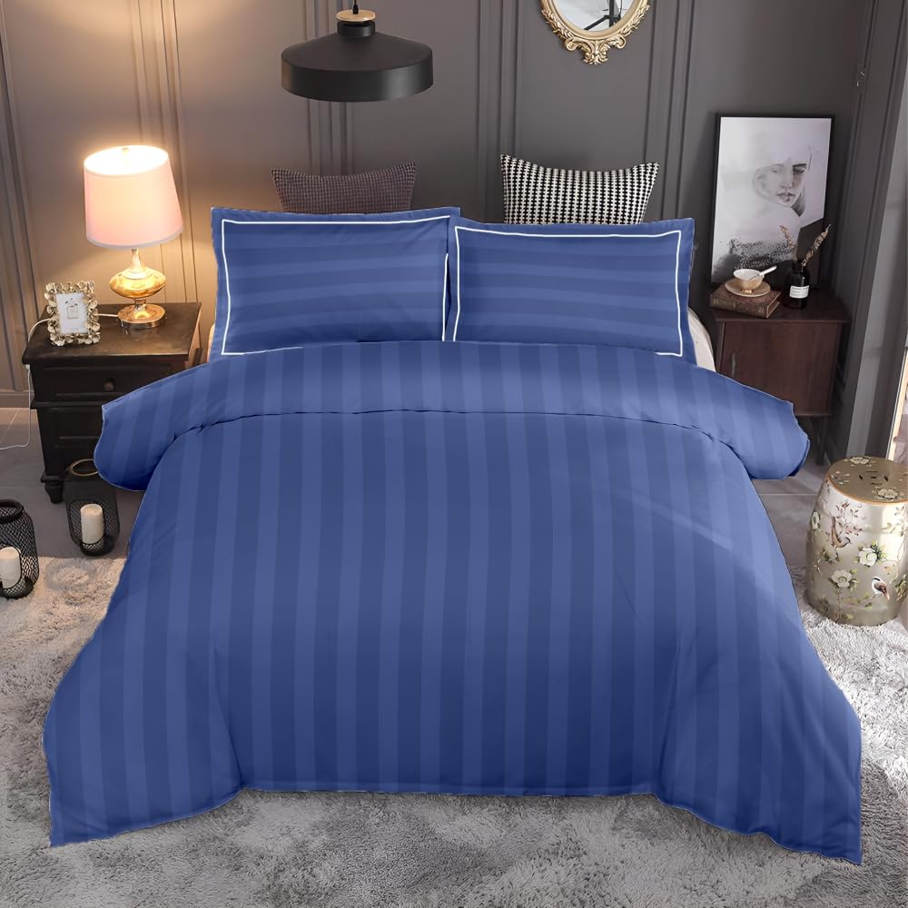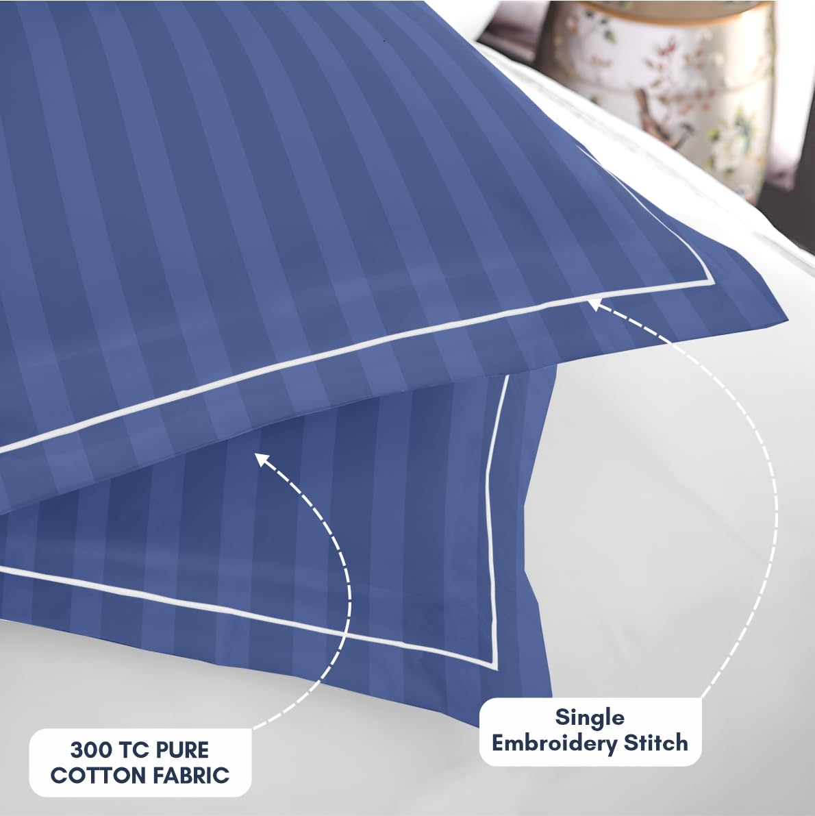 Elevate your bedroom with the Customizable Pure Cotton Dyed Elysian Satin Stripes Bedsheet in Blue. Crafted from premium 300-thread-count cotton satin, this king-size set offers a smooth, breathable finish that blends softness with durability. The refined 2 cm sateen stripe pattern woven into the fabric brings understated elegance. In comparison, the complete set includes one flat sheet and an embroidered pillow cover (46 x 69 cm) (if required), providing a cohesive and luxurious bedding solution. Designed by Enchant Home for lasting comfort with style and customizable according to your requirements.