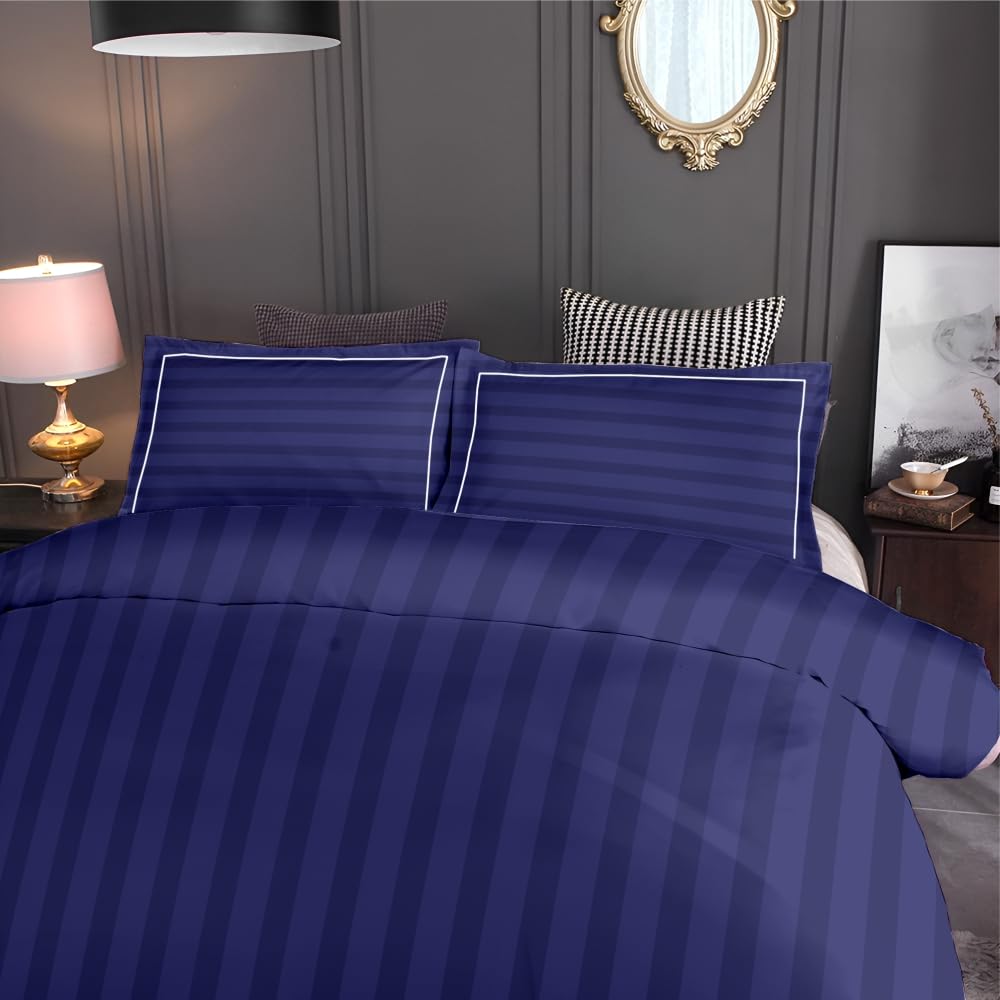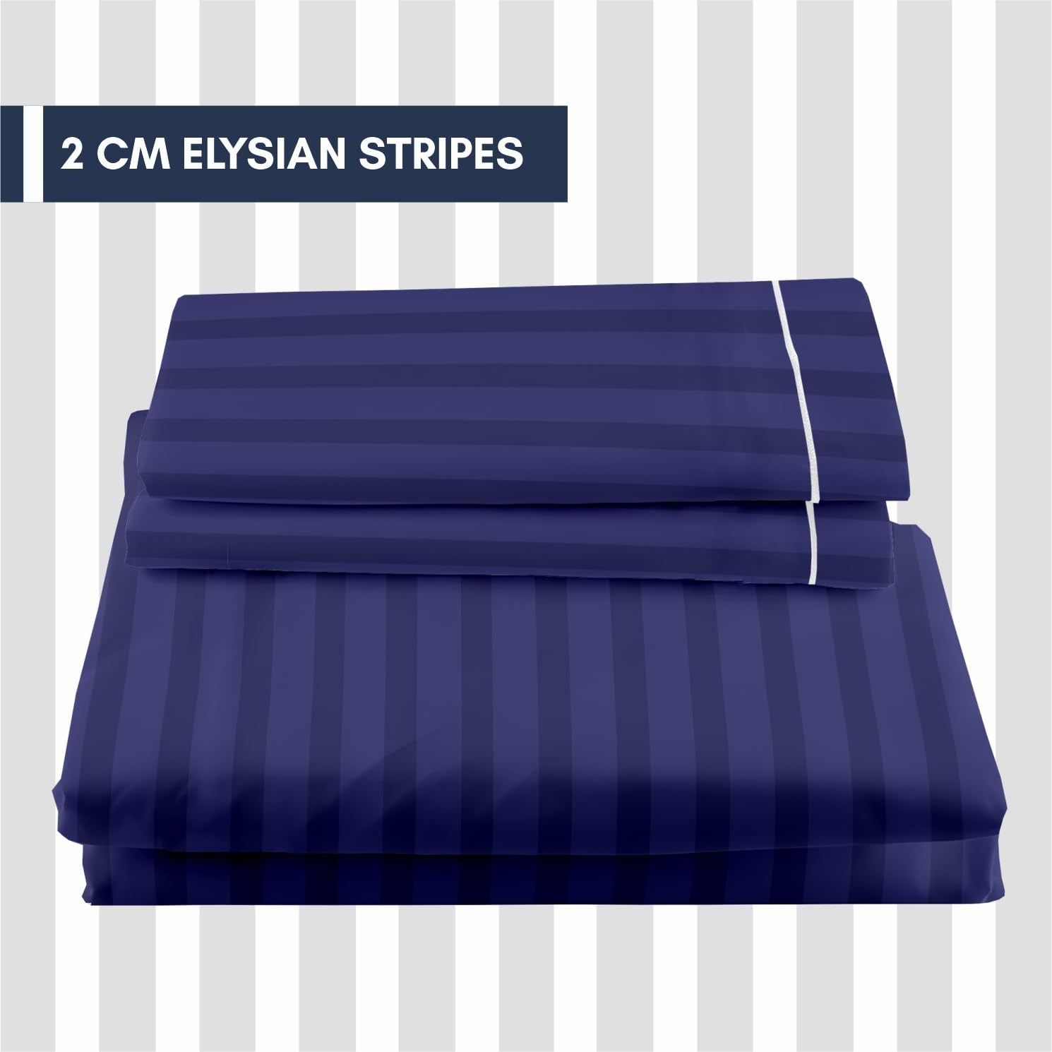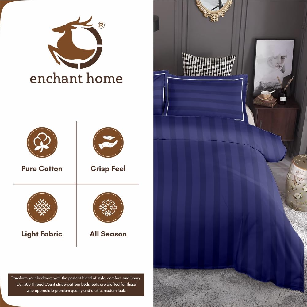 Elevate your bedroom with the Customizable Pure Cotton Dyed Elysian Satin Stripes Bedsheet in Nevy Blue. Crafted from premium 300-thread-count cotton satin, this king-size set offers a smooth, breathable finish that blends softness with durability. The refined 2 cm sateen stripe pattern woven into the fabric brings understated elegance. In comparison, the complete set includes one flat sheet and an embroidered pillow cover (46 x 69 cm) (if required), providing a cohesive and luxurious bedding solution. Designed by Enchant Home for lasting comfort with style and customizable according to your requirements.
