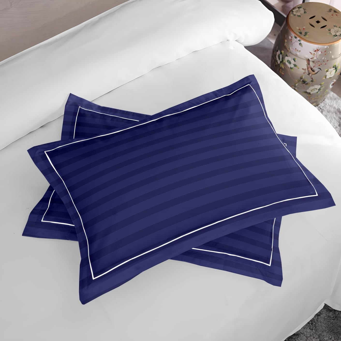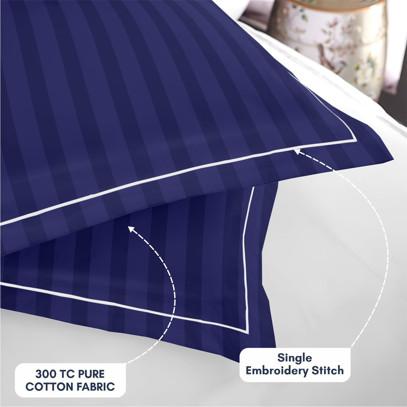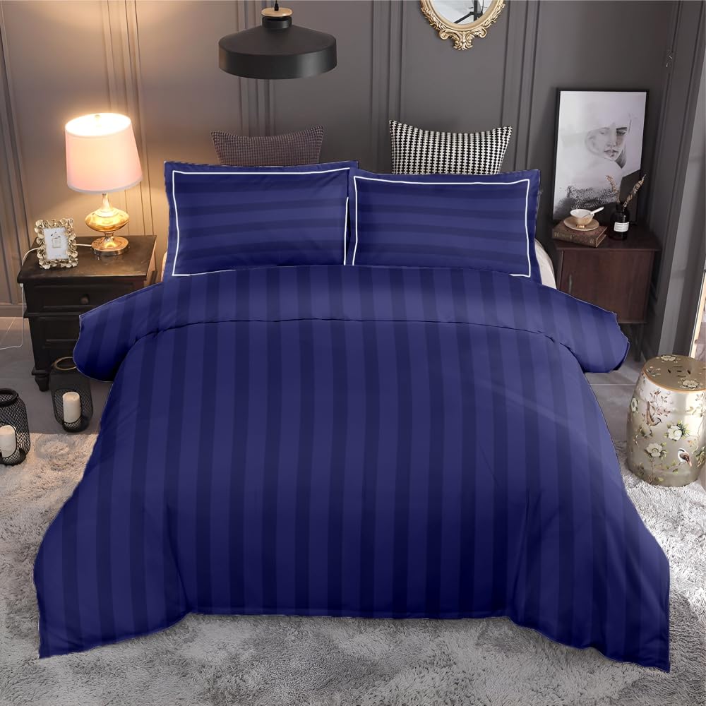 Elevate your bedroom with the Customizable Pure Cotton Dyed Elysian Satin Stripes Bedsheet in Nevy Blue. Crafted from premium 300-thread-count cotton satin, this king-size set offers a smooth, breathable finish that blends softness with durability. The refined 2 cm sateen stripe pattern woven into the fabric brings understated elegance. In comparison, the complete set includes one flat sheet and an embroidered pillow cover (46 x 69 cm) (if required), providing a cohesive and luxurious bedding solution. Designed by Enchant Home for lasting comfort with style and customizable according to your requirements.