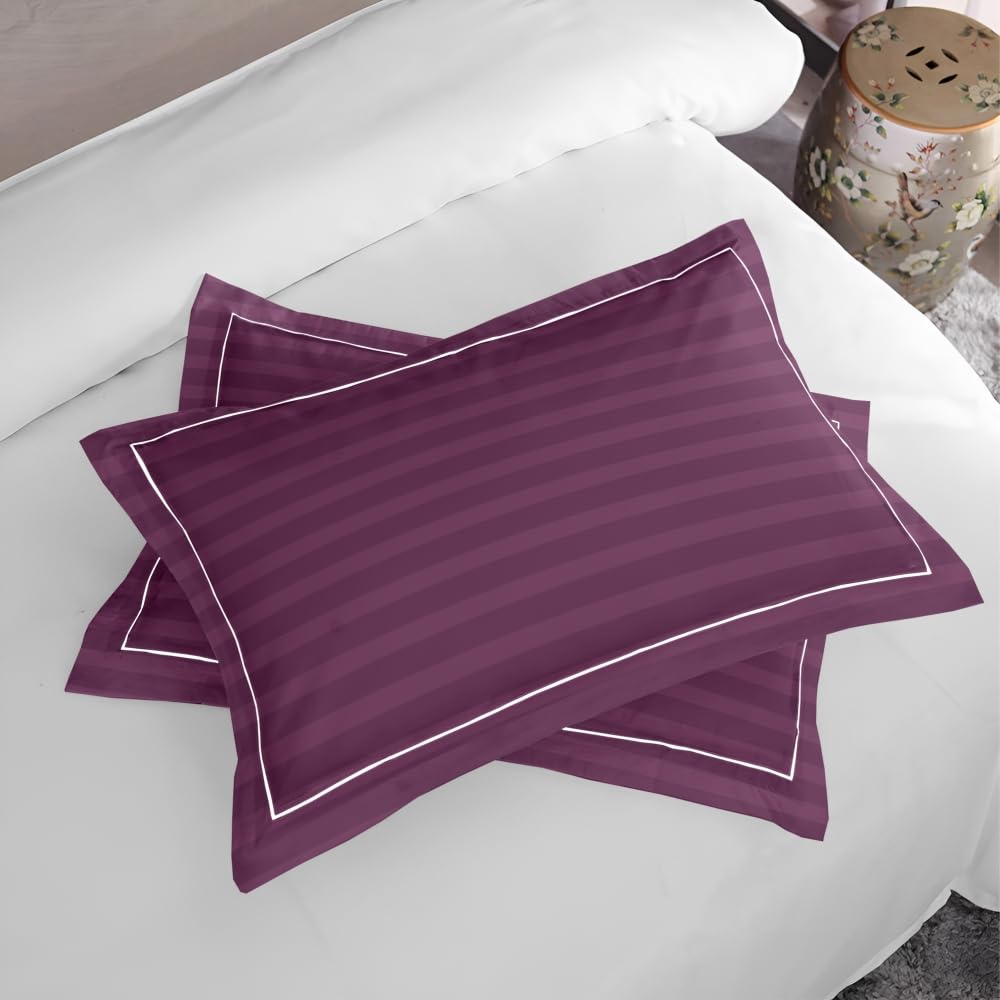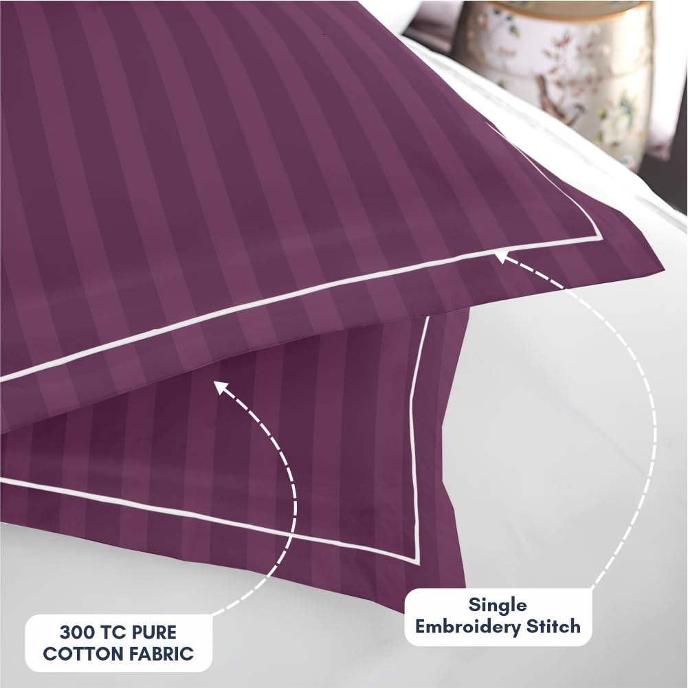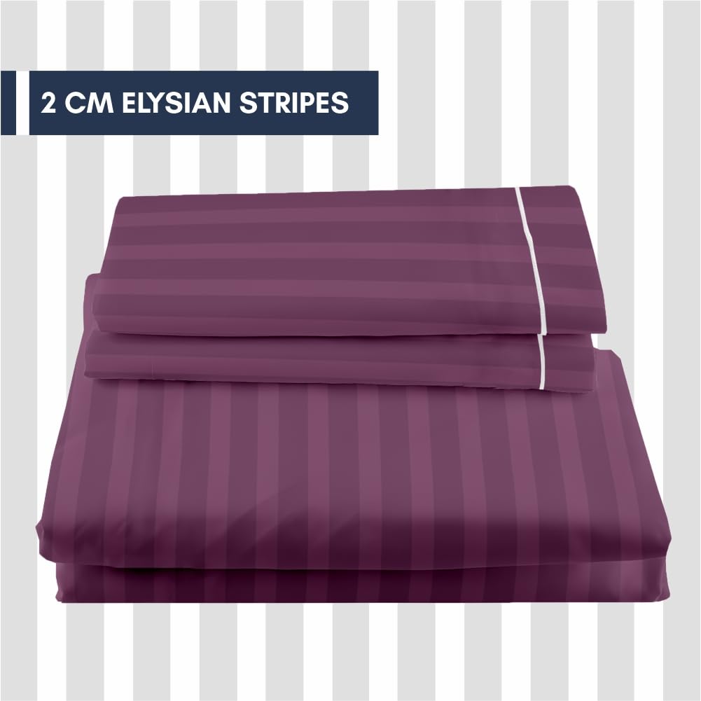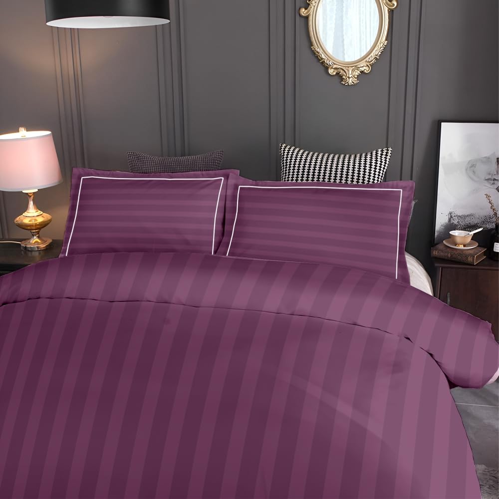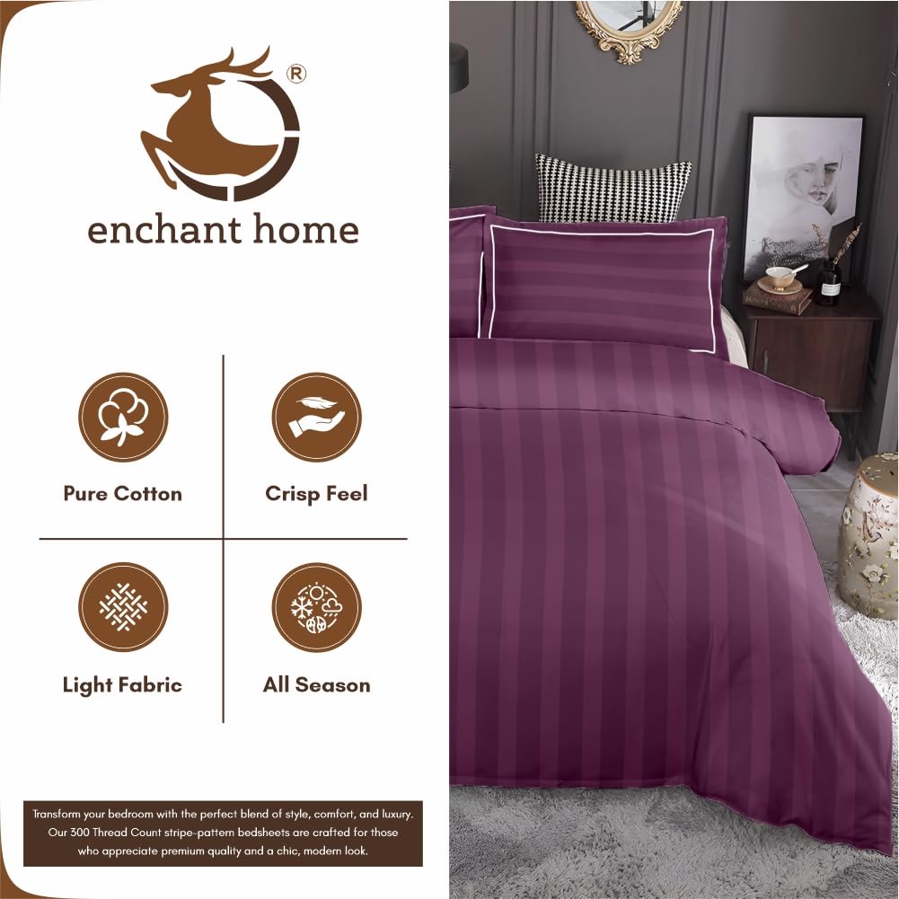 Elevate your bedroom with the Customizable Pure Cotton Dyed Elysian Satin Stripes Bedsheet in Plum. Crafted from premium 300-thread-count cotton satin, this king-size set offers a smooth, breathable finish that blends softness with durability. The refined 2 cm sateen stripe pattern woven into the fabric brings understated elegance. In comparison, the complete set includes one flat sheet and an embroidered pillow cover (46 x 69 cm) (if required), providing a cohesive and luxurious bedding solution. Designed by Enchant Home for lasting comfort with style and customizable according to your requirements.