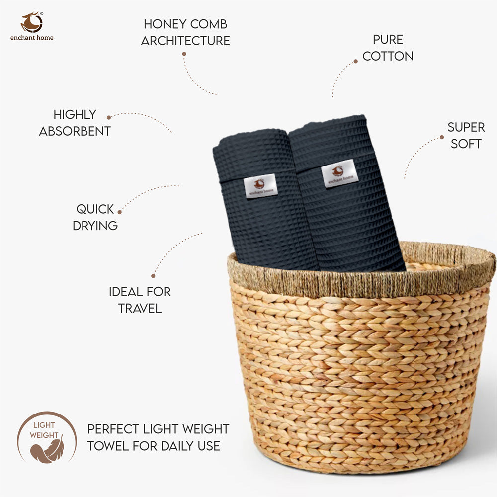 • ABSORBENT LUXURY: Made of super soft cotton, these waffle-weave towels soak up water quickly and comfortably.